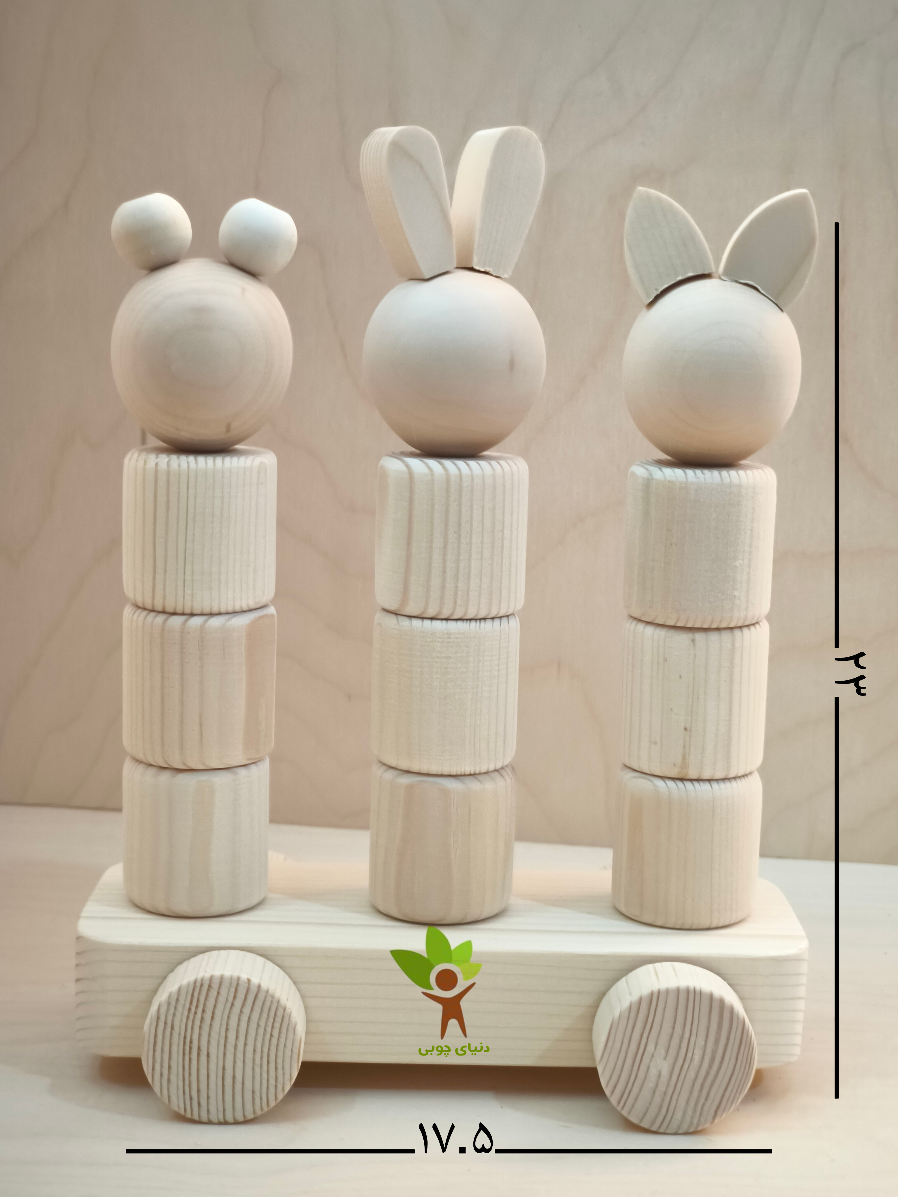 استوانهای چرخدار حیوانات چوبی، ترکیبی از طراحی زیبا و عملکرد آموزشی است. این اسباببازی با چوب طبیعی ساخته شده و شامل سه ستون استوانهای با حیوانات مختلف مانند خرس، خرگوش و گربه و یا روباه میباشد. پایهی چرخدار آن باعث میشود کودک آن را حرکت دهد و در بازیهای تخیلی خود استفاده کند.